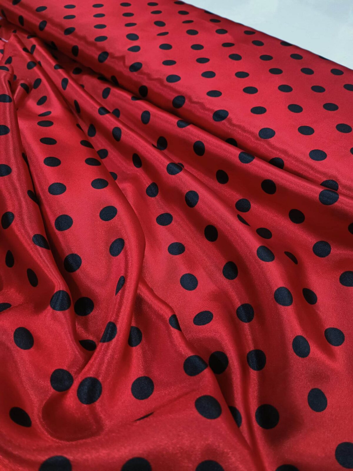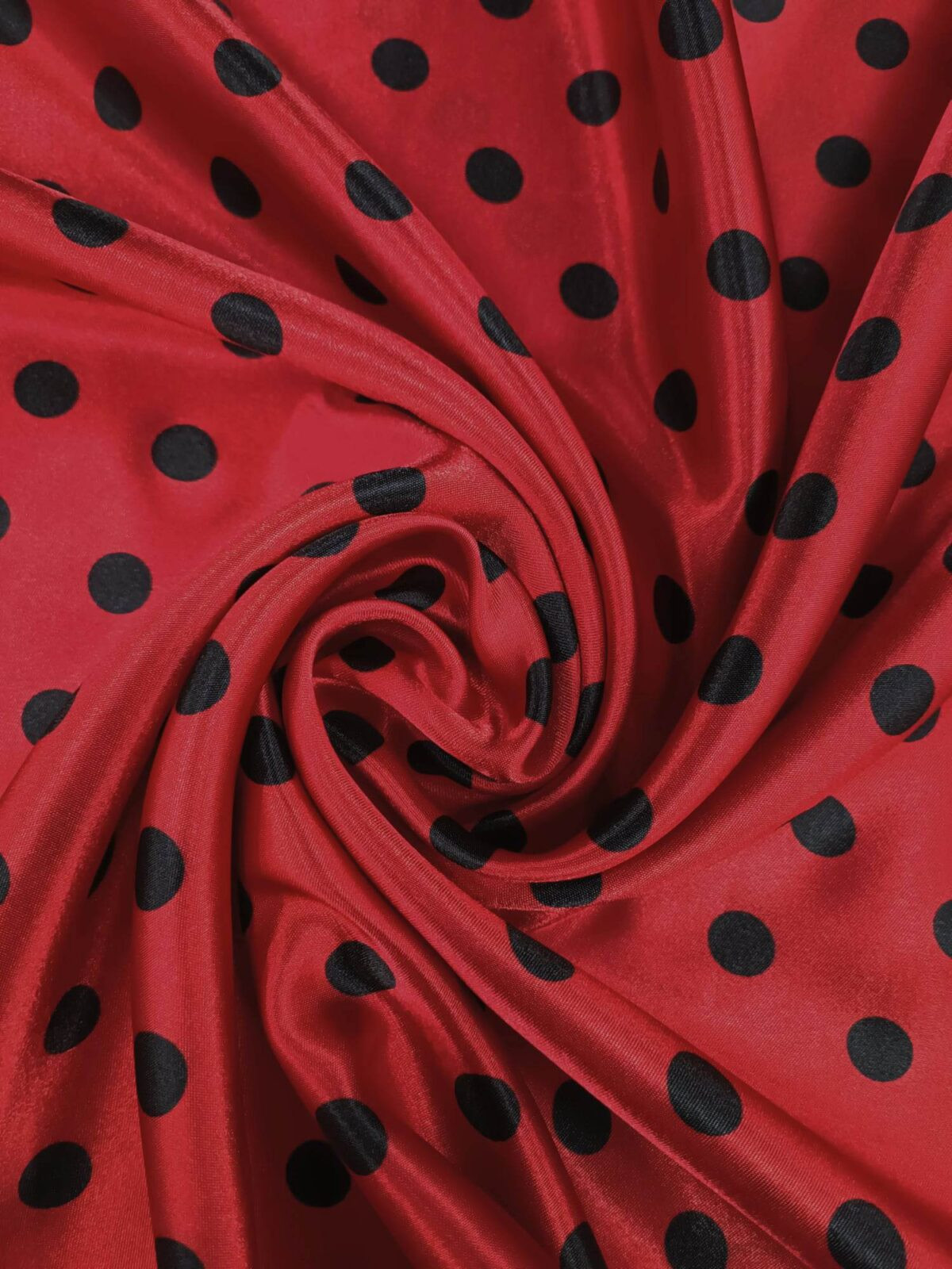 בד סאטן מודפס עיגולים שחורים על רקע אדום