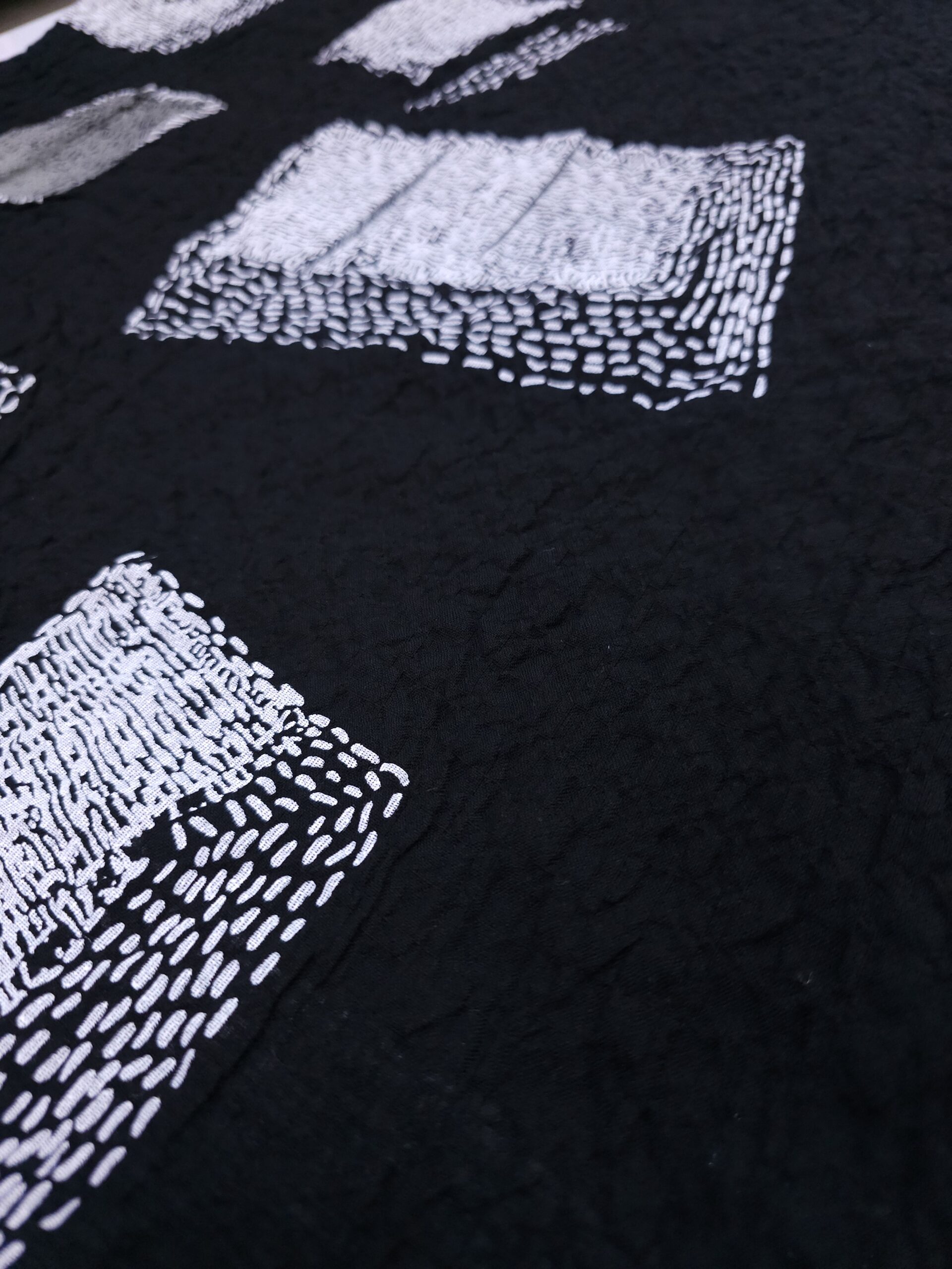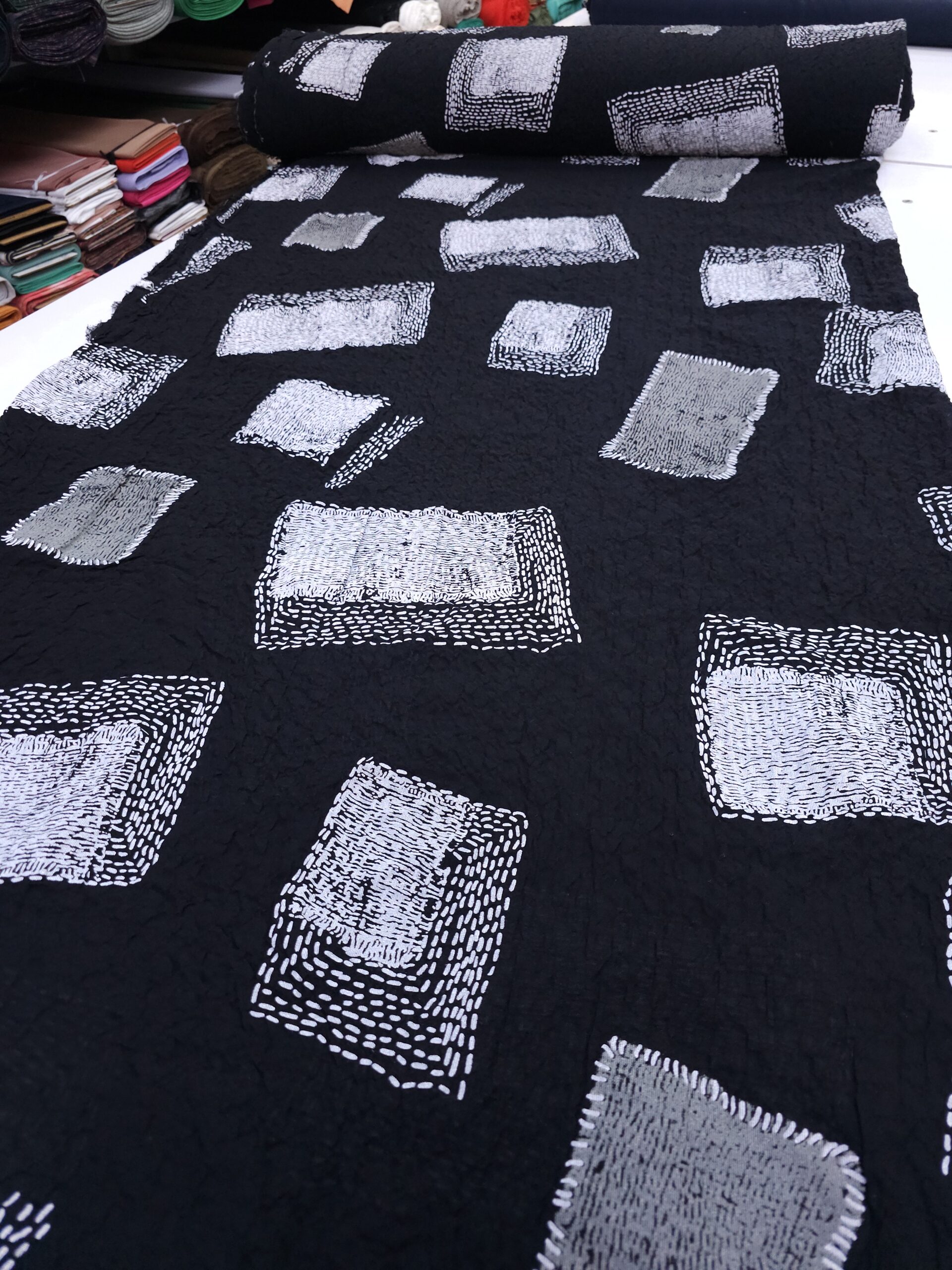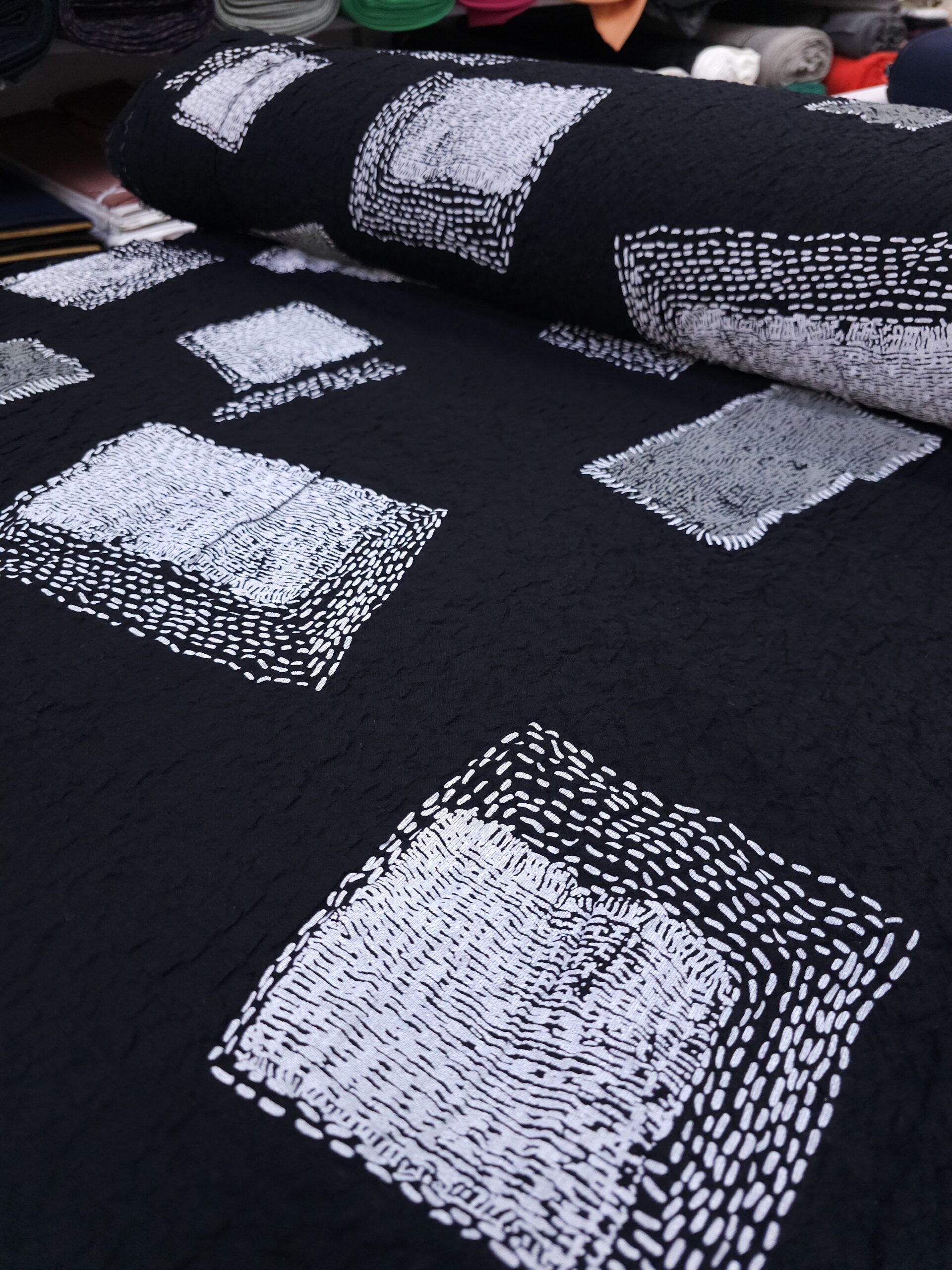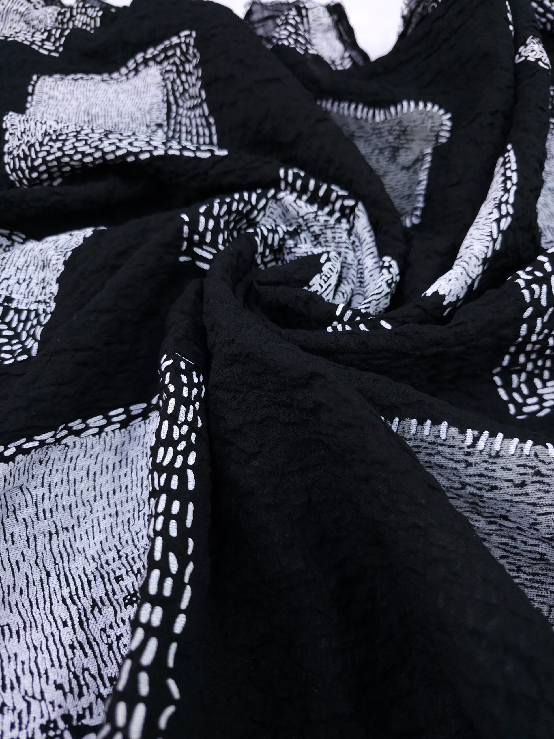 שיפון קליל עם מרקם מקומט טבעי והדפס גיאומטרי חופשי בגוון לבן על רקע שחור.