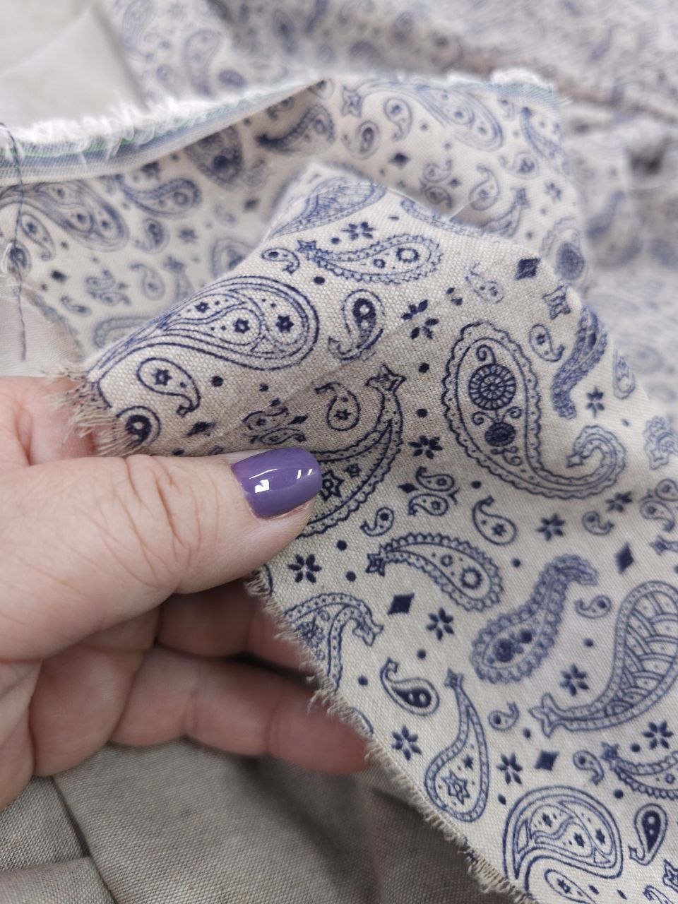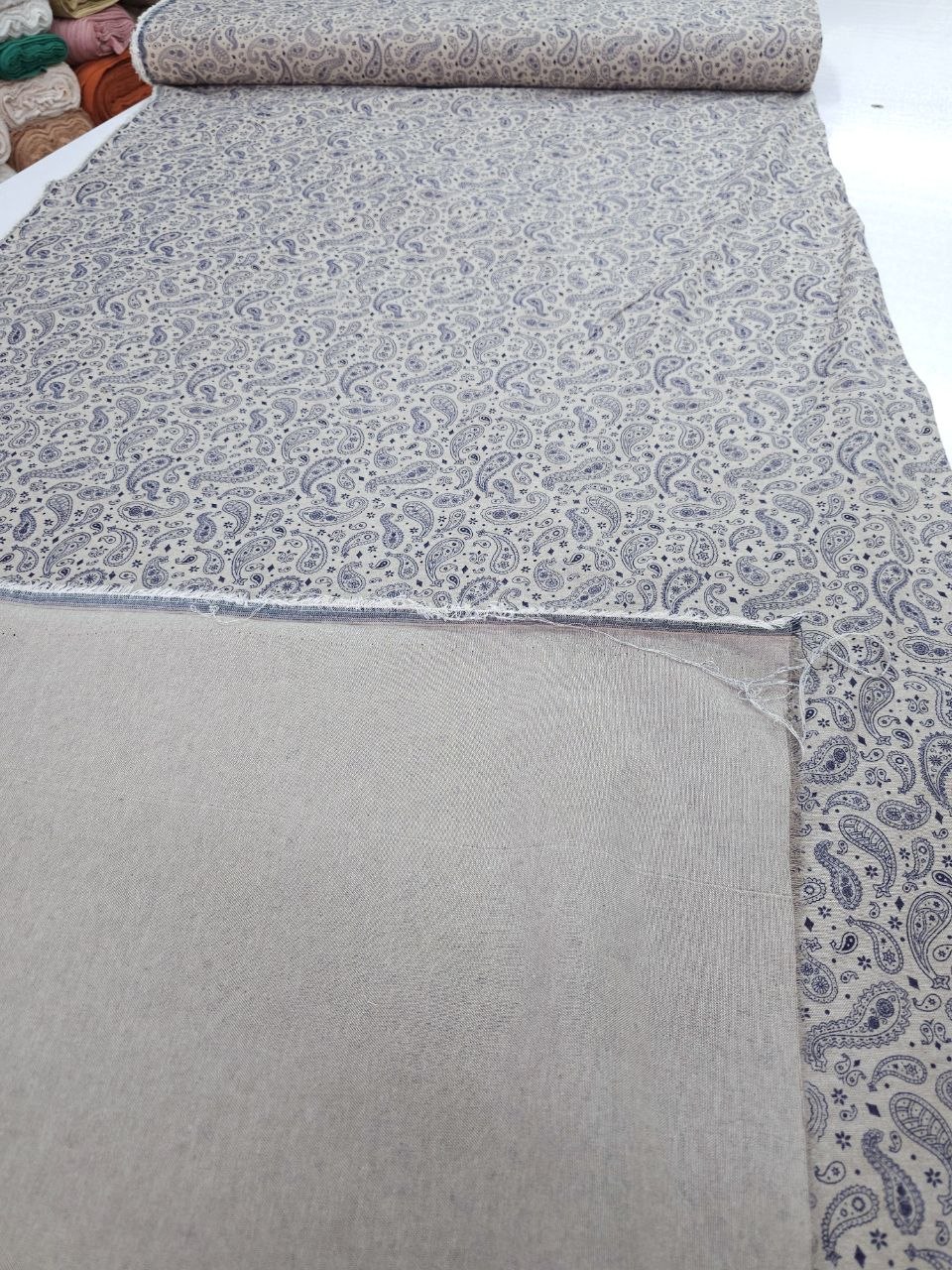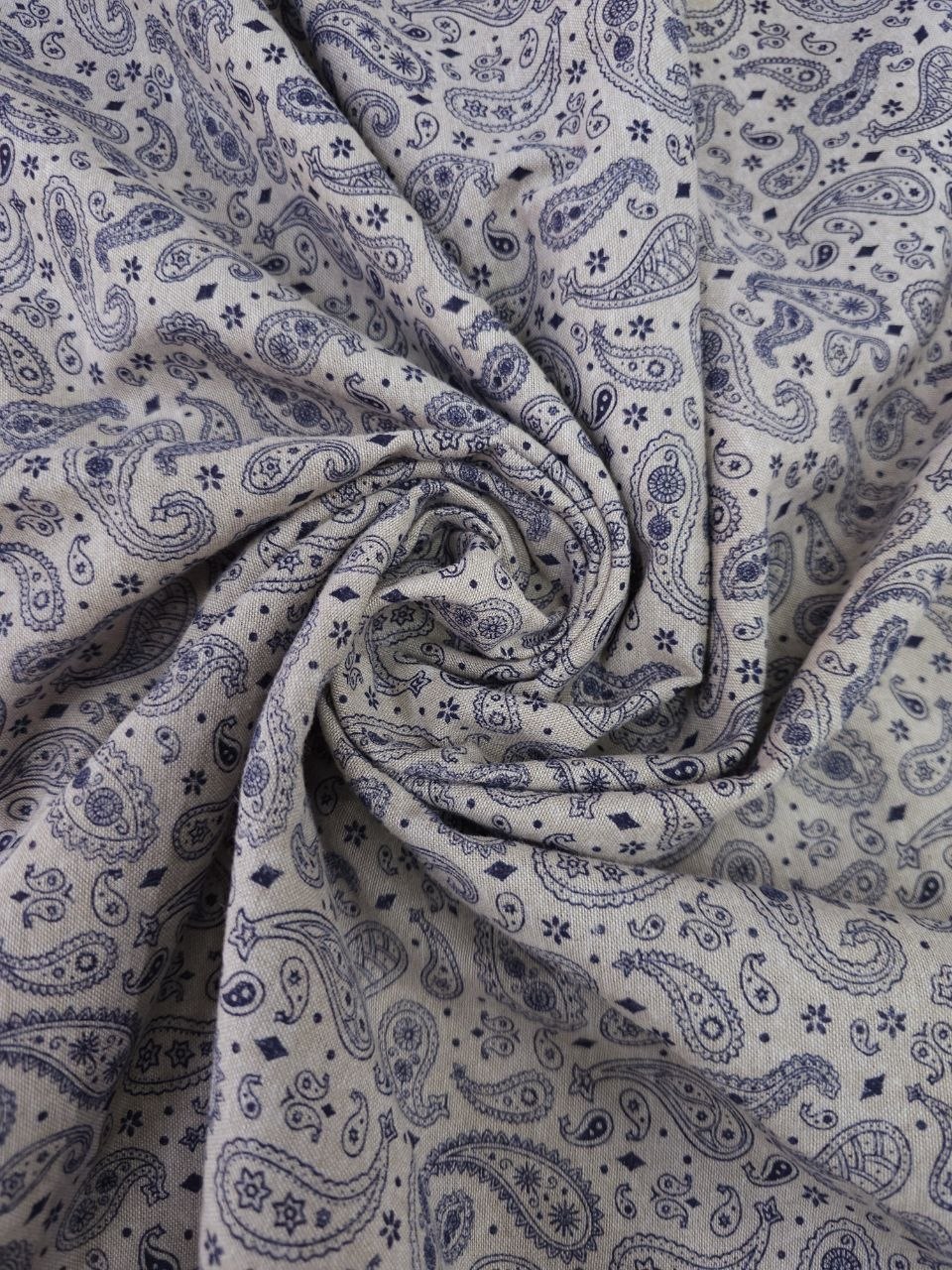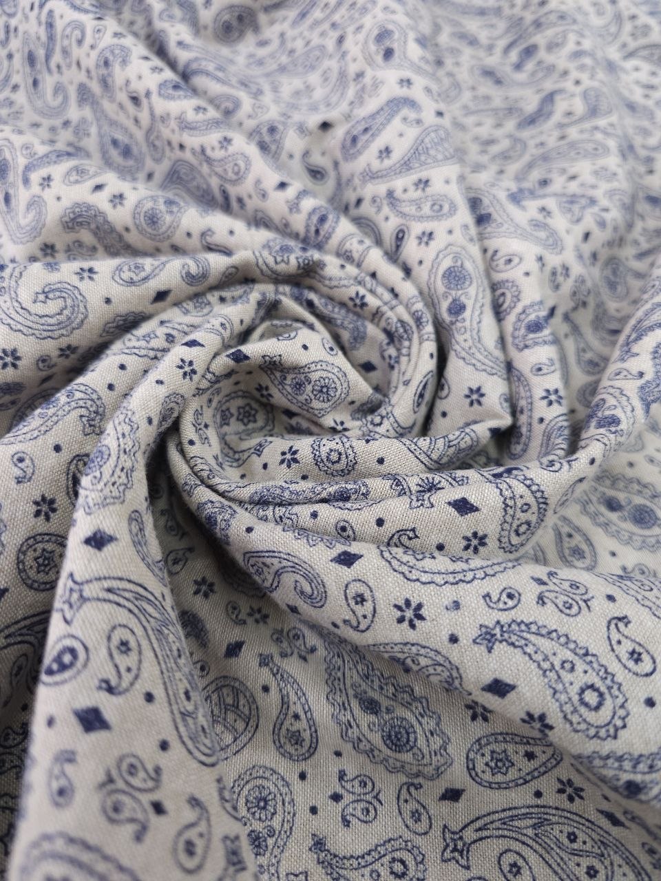 הדפס פייזלי עדין בגווני כחול על רקע בהיר נותן מראה קלאסי ושקט.
