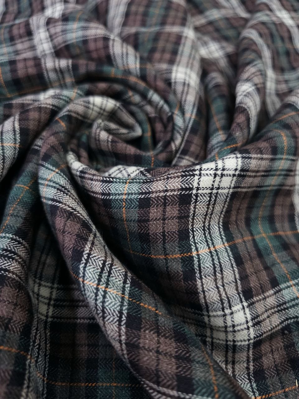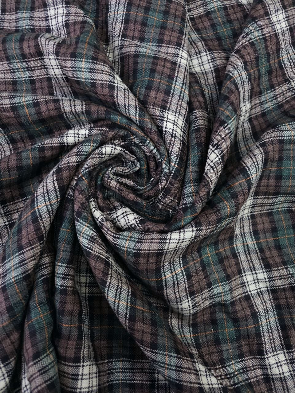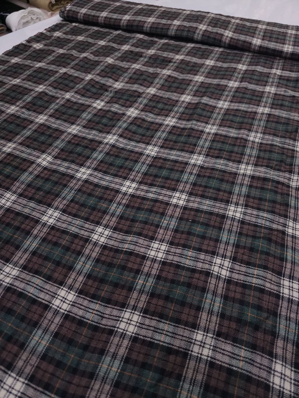 בד כותנה משובץ בגוונים עמוקים של ירוק, חום ושמנת, עם קווים דקים בנגיעות חמות.