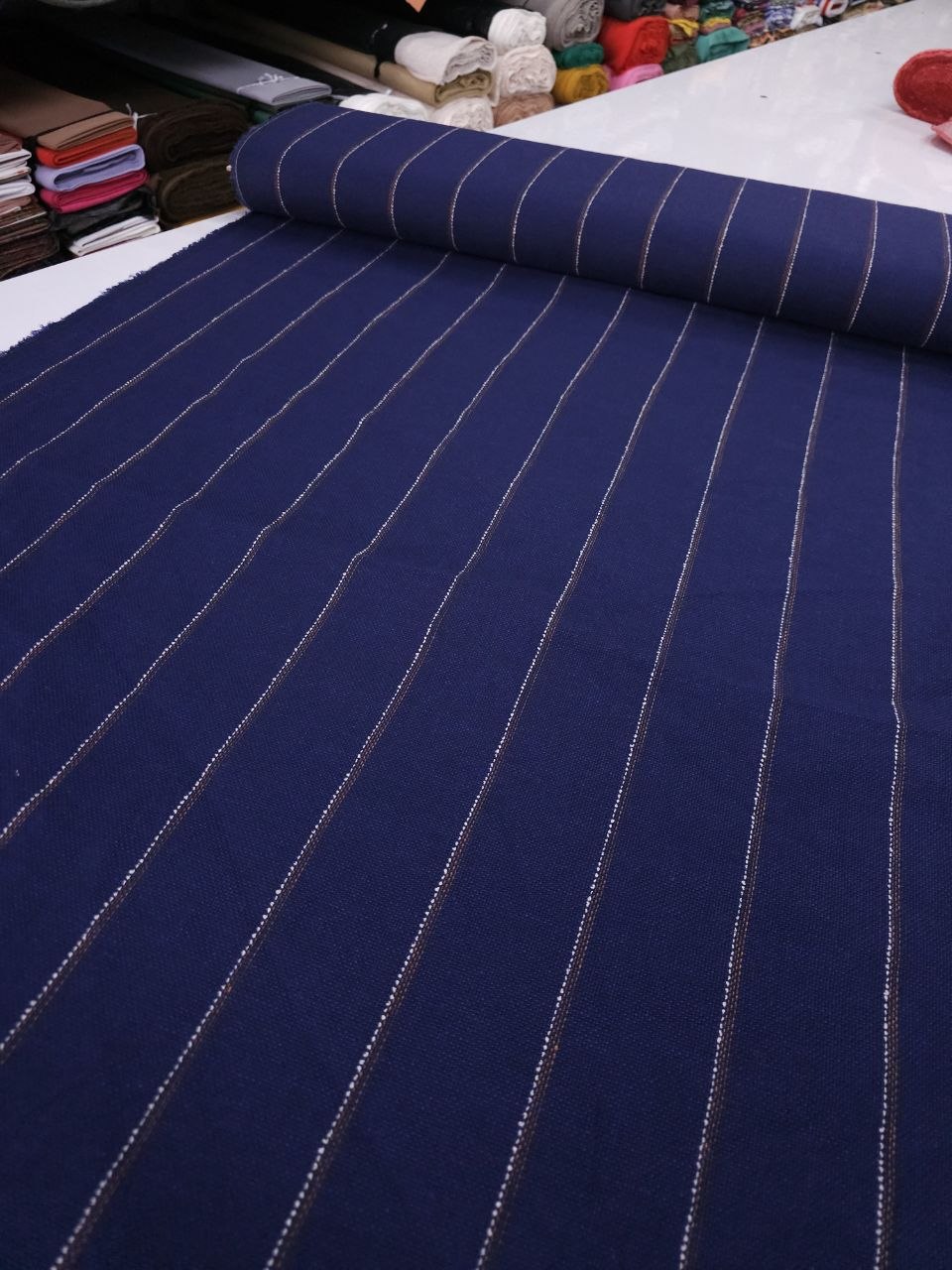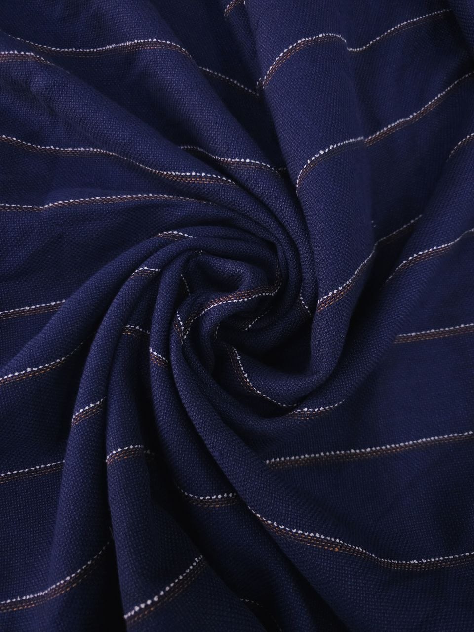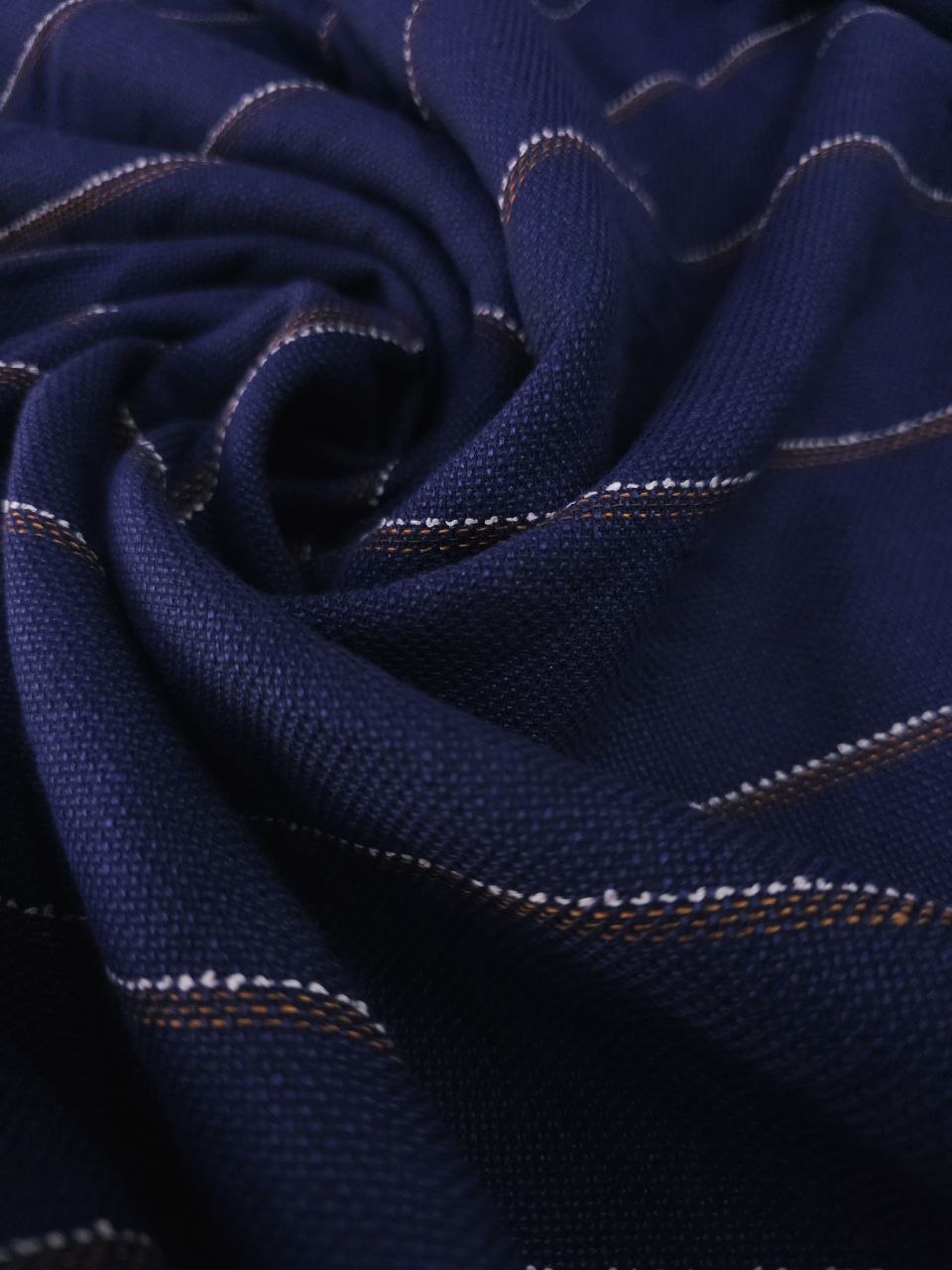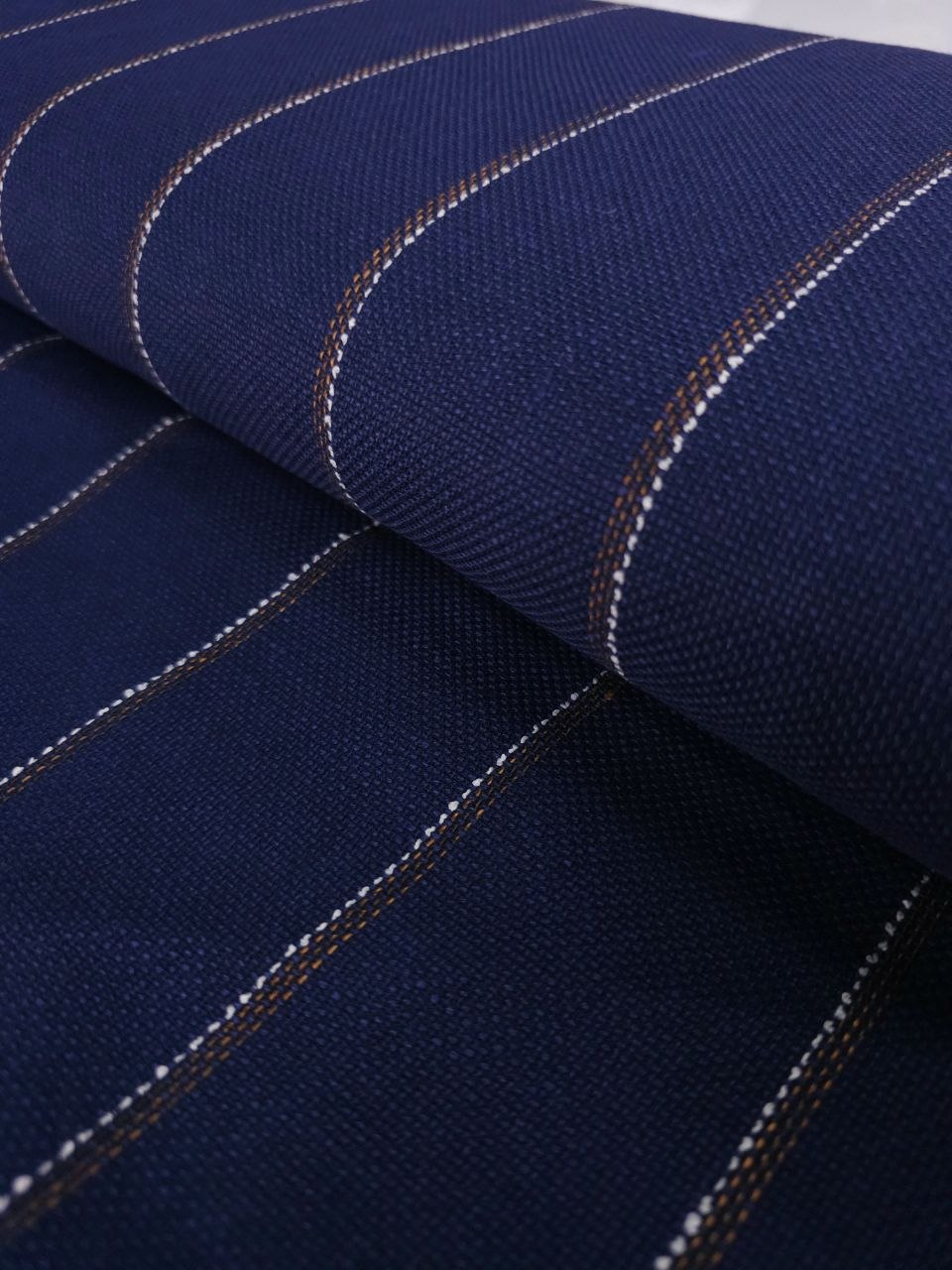 פשתן בגוון כחול עמוק עם פסים דקים לאורך, בשילוב חוטים בהירים וחומים.