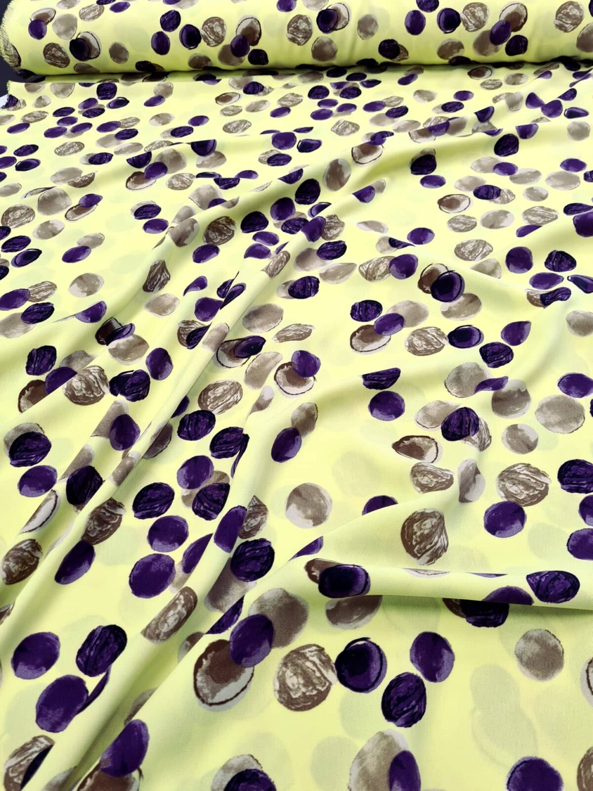 בד קרפ צהוב עם עיגולים סגולים וחומים