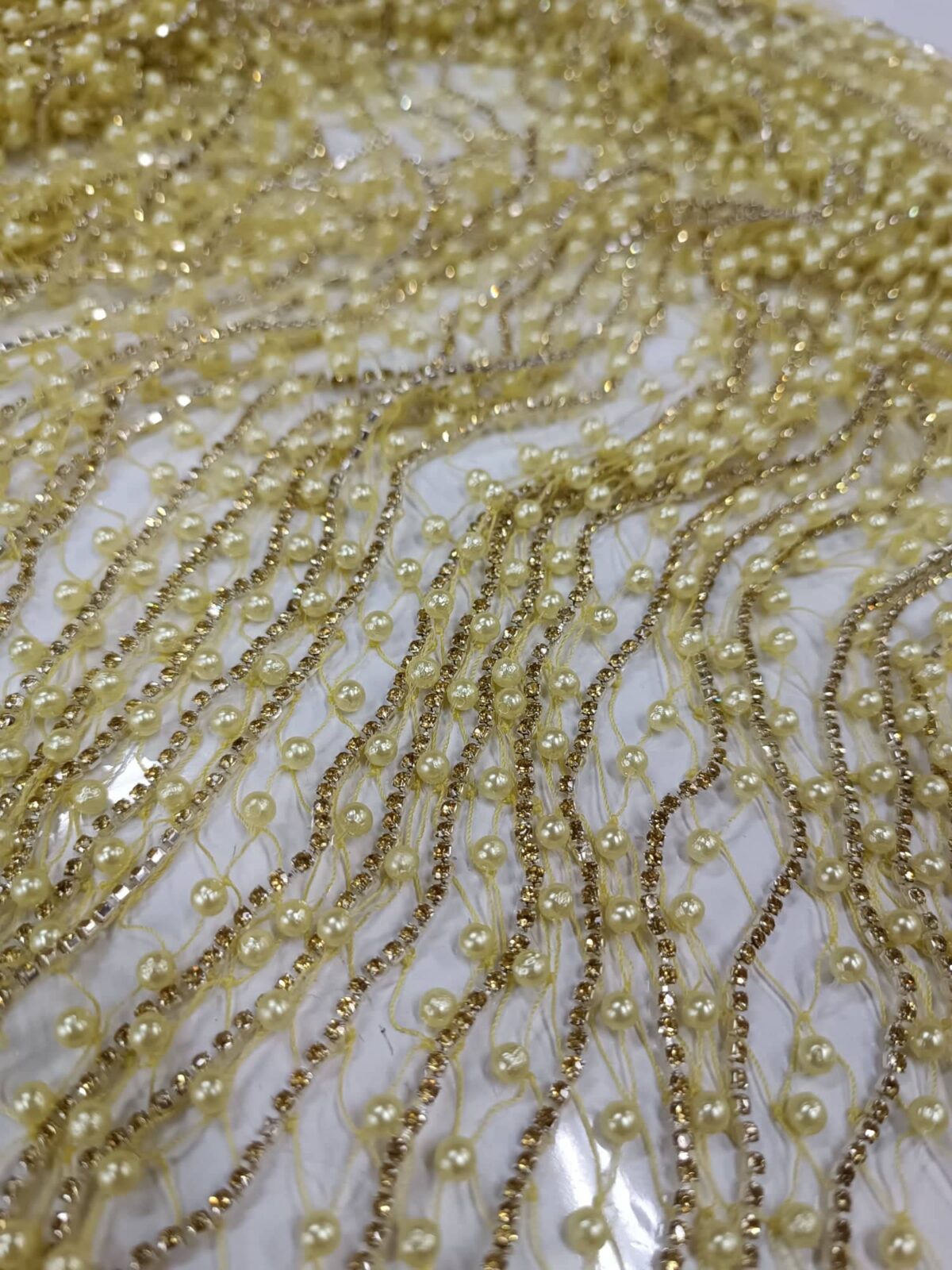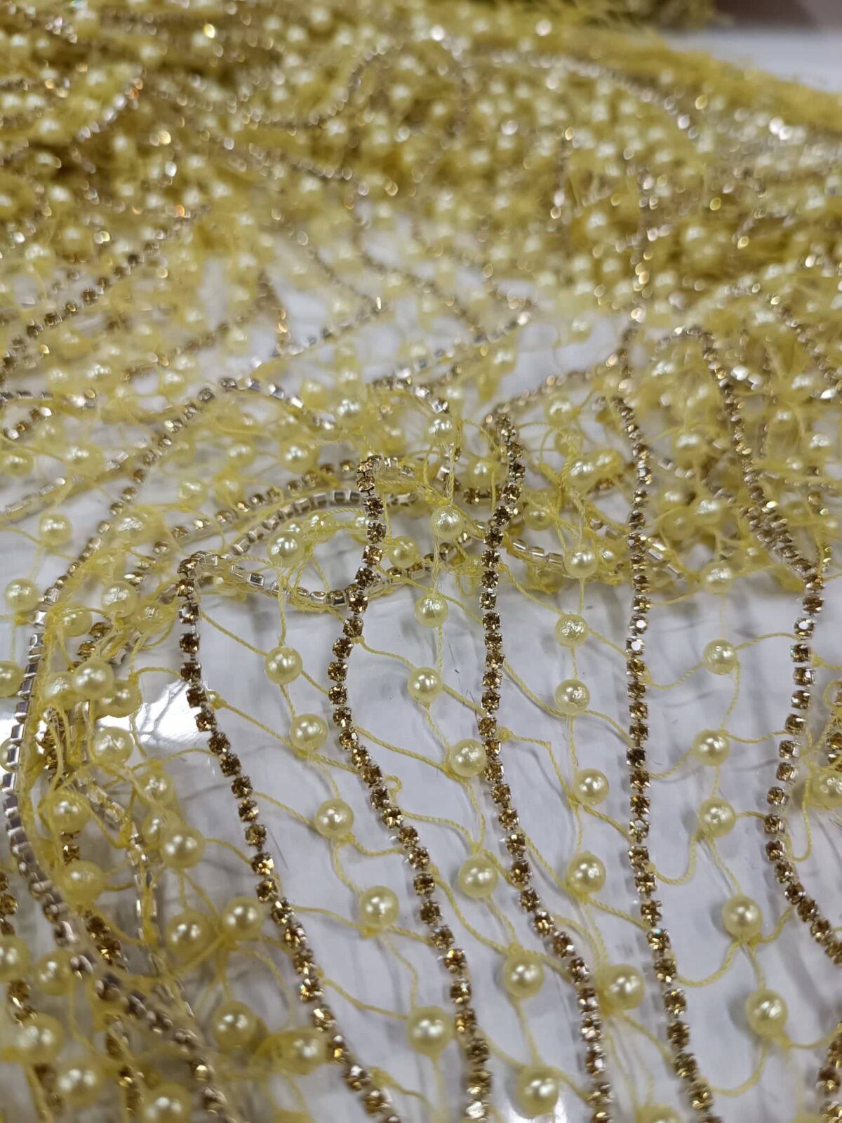 בד רשת מחורז יהלומים ופנינה בצבע צהוב